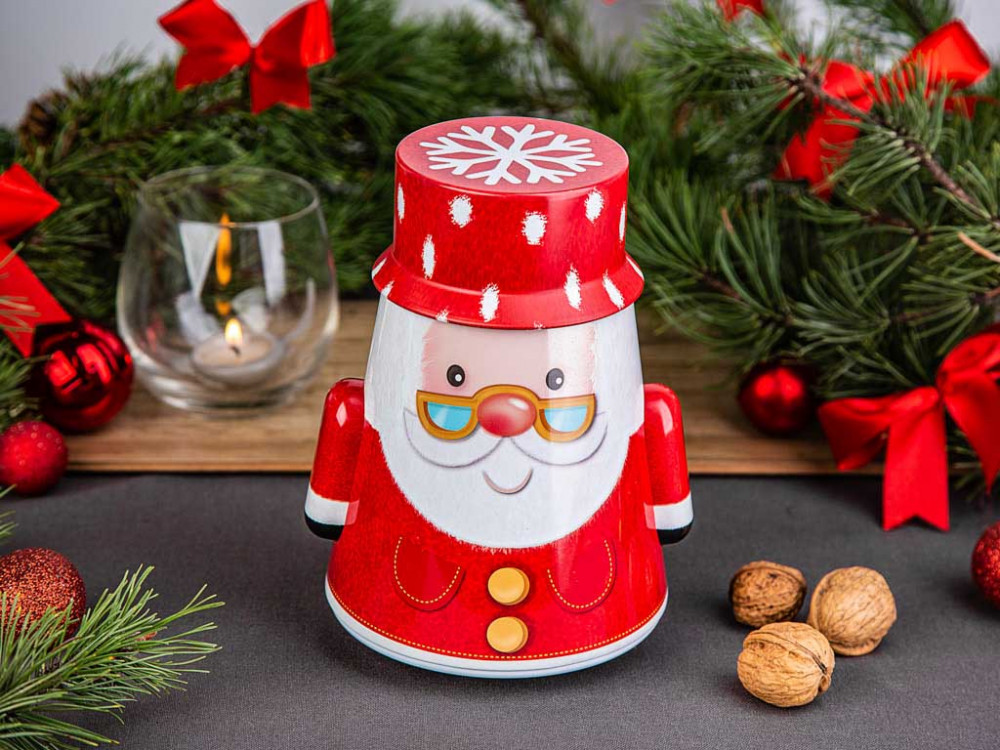 Metalowa puszka z mikołajem to doskonały sposób na przechowywanie świątecznych smakołyków. Puszka, zaopatrzona w specjalne wieczko, pozwoli na zachowanie smaku i aromatu pysznych łakoci. Dekoracyjna puszka doda prawdziwego uroku świątecznej aranżacji, zarówno w kuchni, jak i w jadalni. Świąteczna puszka to również doskonały pomysł na drobny upominek. Śliczna i praktyczna.