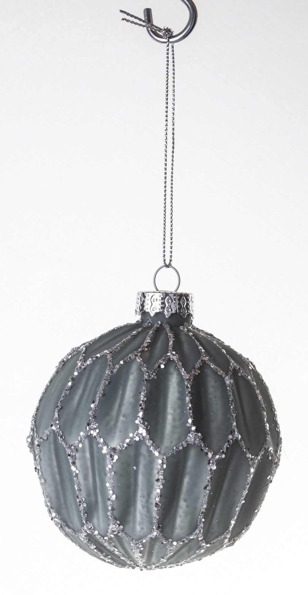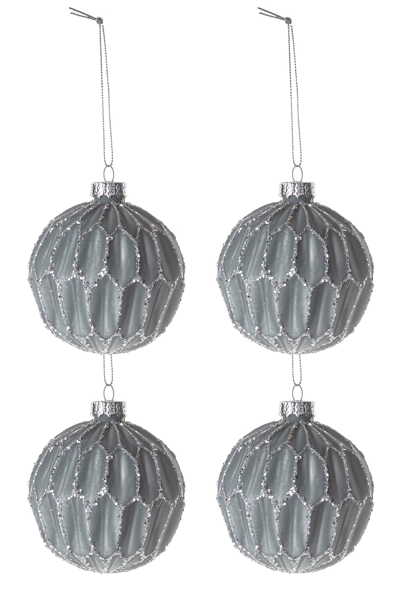 Komplet czterech, szklanych baniek w niebieskim kolorze. Ozdobione brokatowym paskiem. Piękna ozdoba choinkowa.