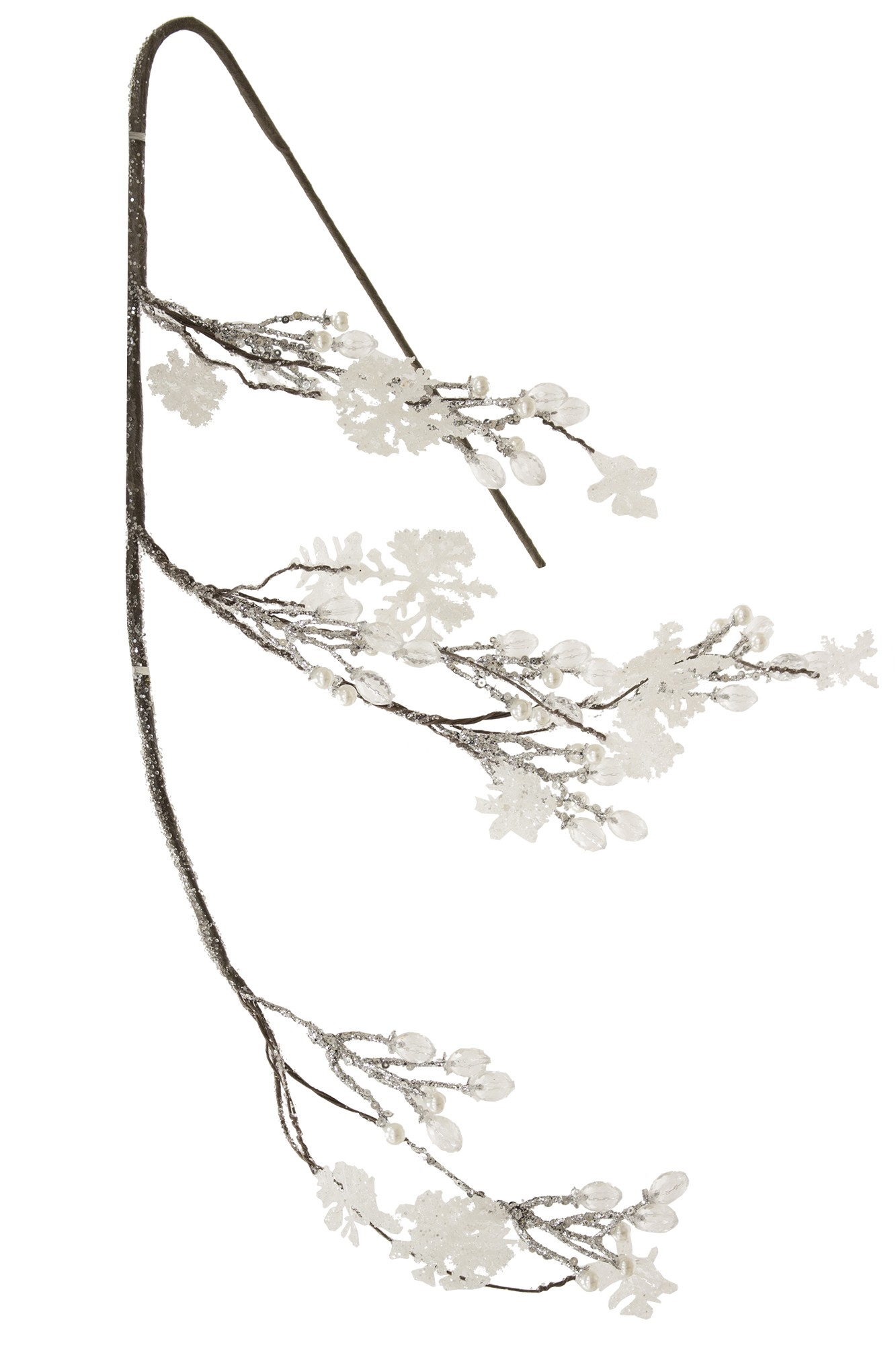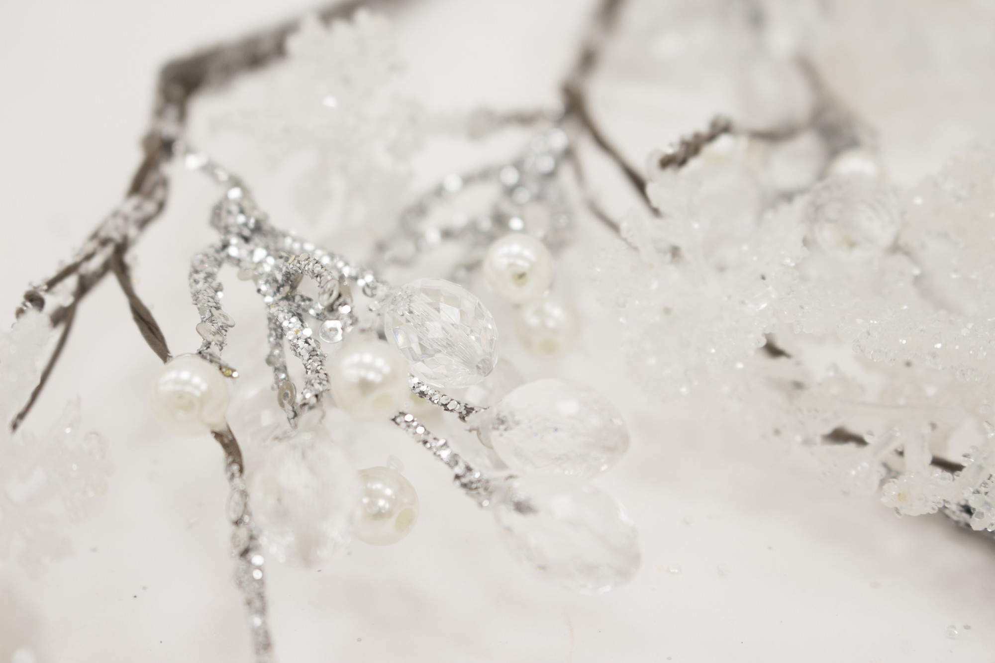 Gałązka w wersji zimowej. Pokryta brokatem, drobniutkimi cekinami i koralikami. Całość pięknie lśni i błyszczy. Dominujący kolor srebrny. Doskonała do świątecznych dekoracji.