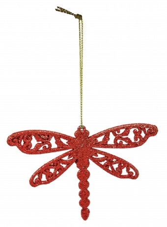 Czerwona zawieszka choinkowa w kształcie ważki. Dodatkowym atutem prezentowanego przedmiotu jest jego ciekawy kształt, a także wykonanie.