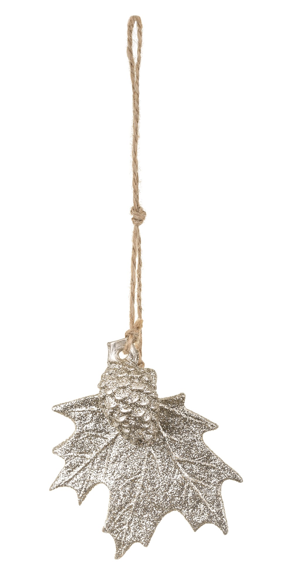 Piękna, brokatowa ozdoba świąteczna w kształcie liścia z szyszką, w szampańskim kolorze. Dodatkowym atutem prezentowanego przedmiotu jest jego ciekawy kształt, a także wykonanie.