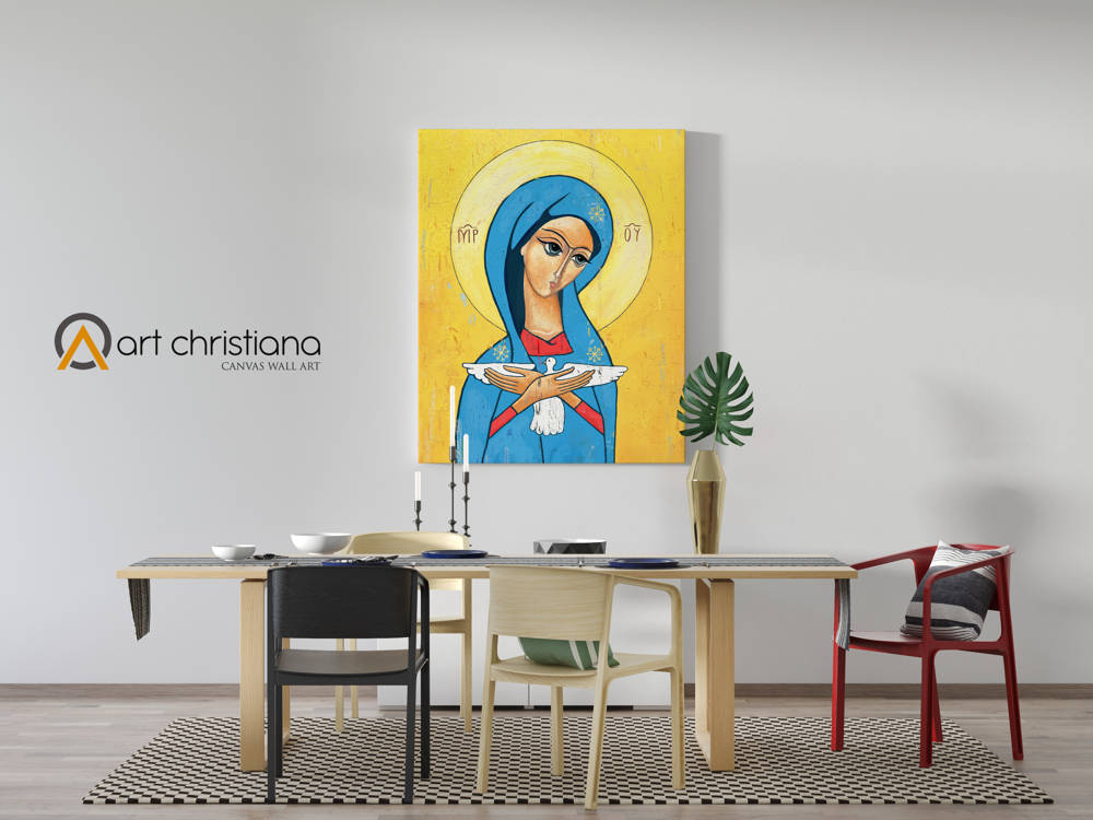 Obraz religijny na płótnie typu canvas przedstawiający Matkę Bożą Niosącą Ducha Świętego. Obraz z wizerunkiem Matki Bożej może stanowić doskonały prezent, z pewnością wniesie do pomieszczenia ciepło i kolor a także może być pomocą w codziennej modlitwie.