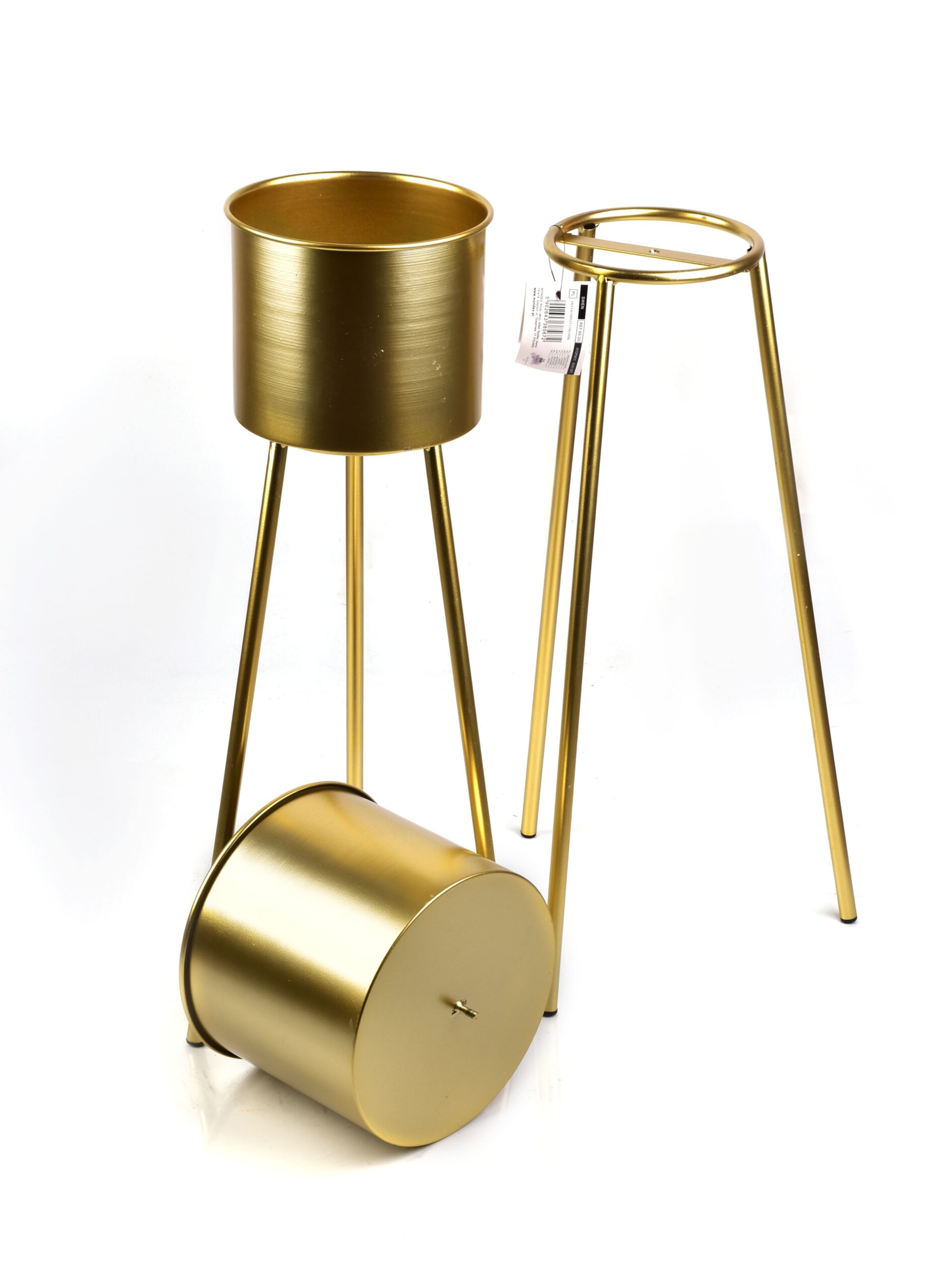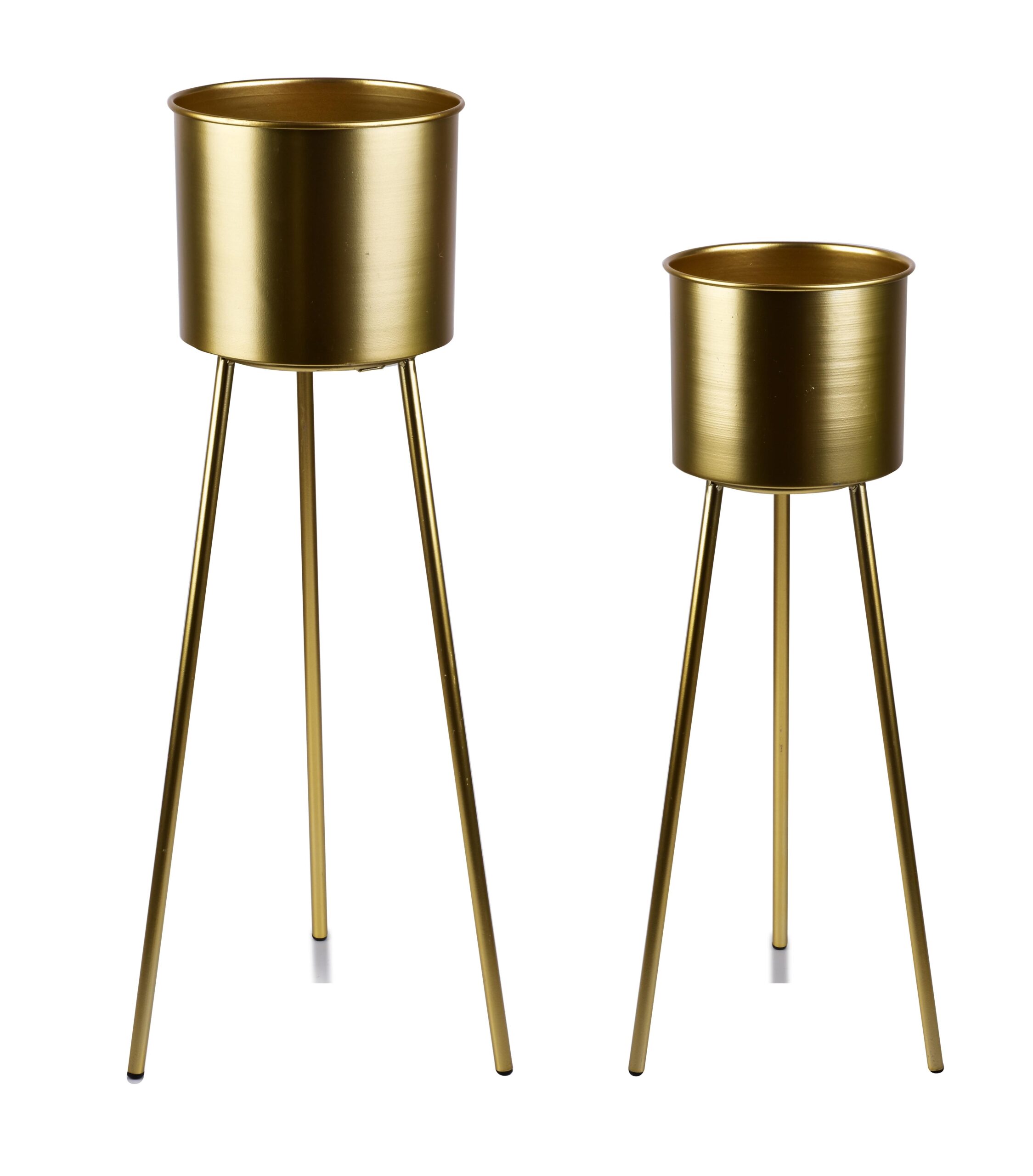 Komplet dwóch doniczek na kwiaty na złotym stojaku.